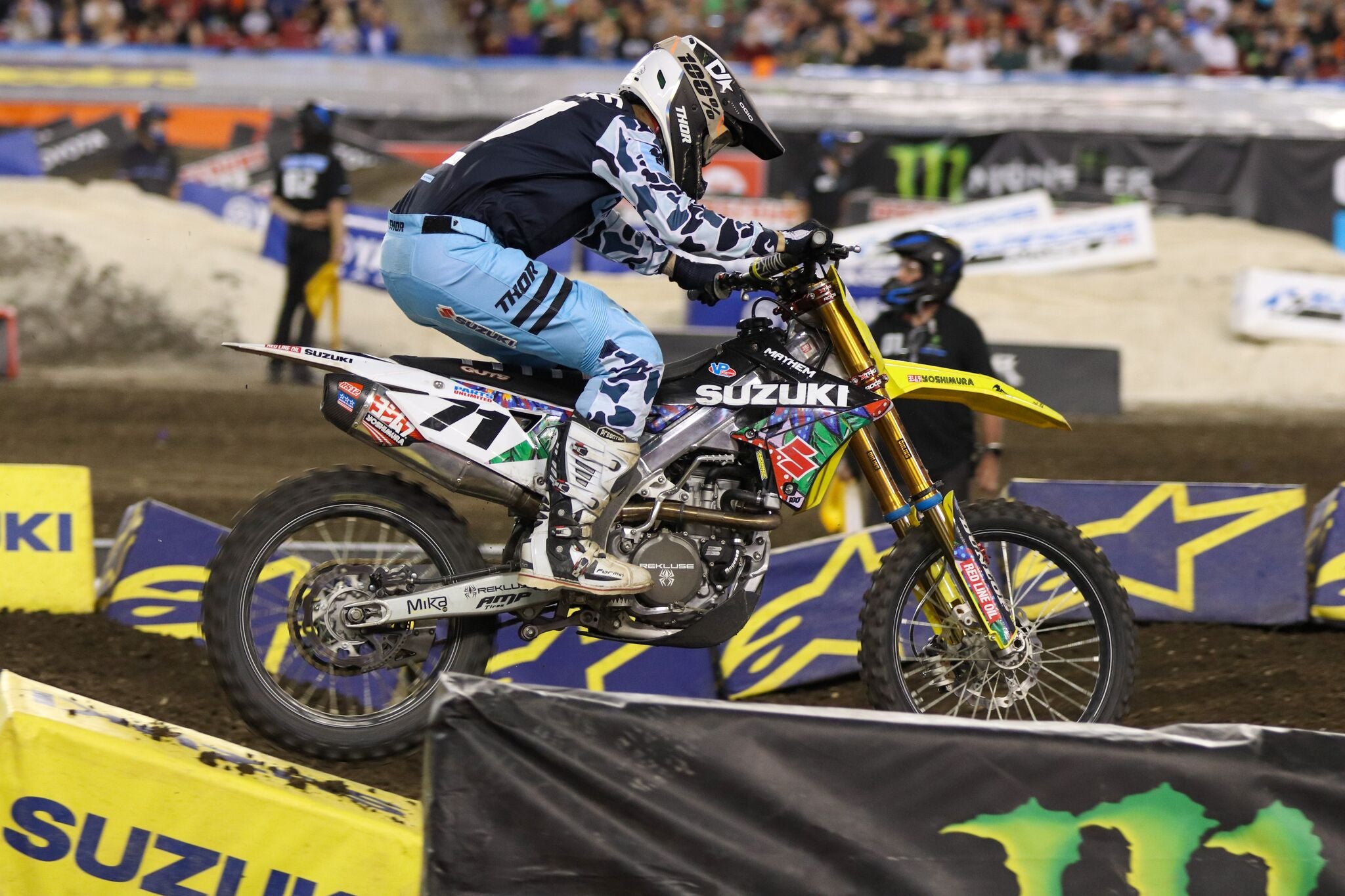 The team’s Suzuki RM-Z450’s had special edition St. Jude Children’s Research Hospital graphics by 180Decals that originated from St. Jude patients. The team also sported Thor MX Pulse Powder Blue kits that displayed the St. Judes’ logo in the center. These race worn gear sets can be purchased at https://www.supercrosslive.com/stjude.