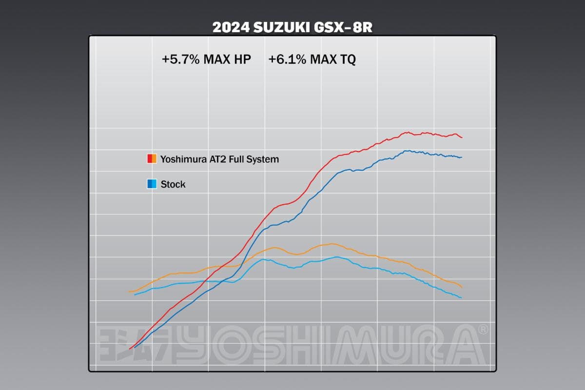 The R&D team dug deep on this one… Our AT2 Race Series Works Finish full system with carbon fiber heel guard was developed to optimize the power on the new 776cc, 270 degree engine and the results were astounding! Adding a Max HP of 5.7%, and a torque gain of 6.1 percent, this is a different motorcycle now! On top of great results on the dyno, the weight saving of over 7 pounds is very substantial and there's no mistaking the sound of a Yoshimura system delivering a sonic tone that does not disappoint!